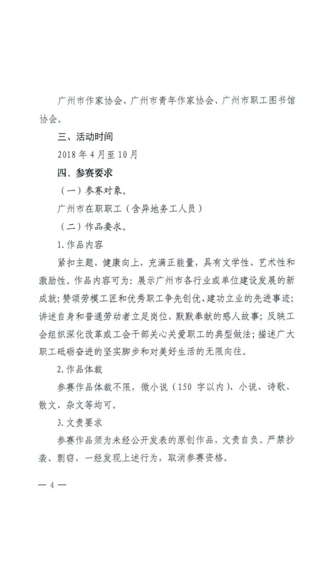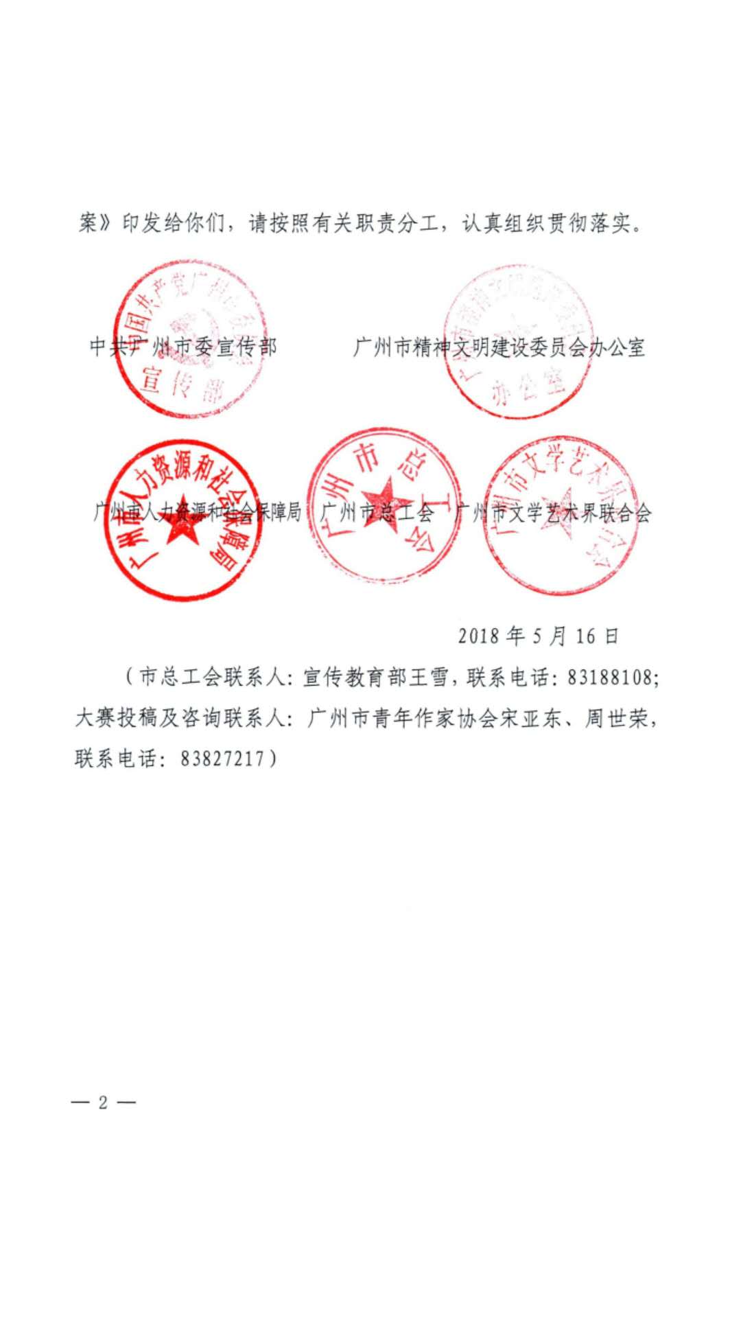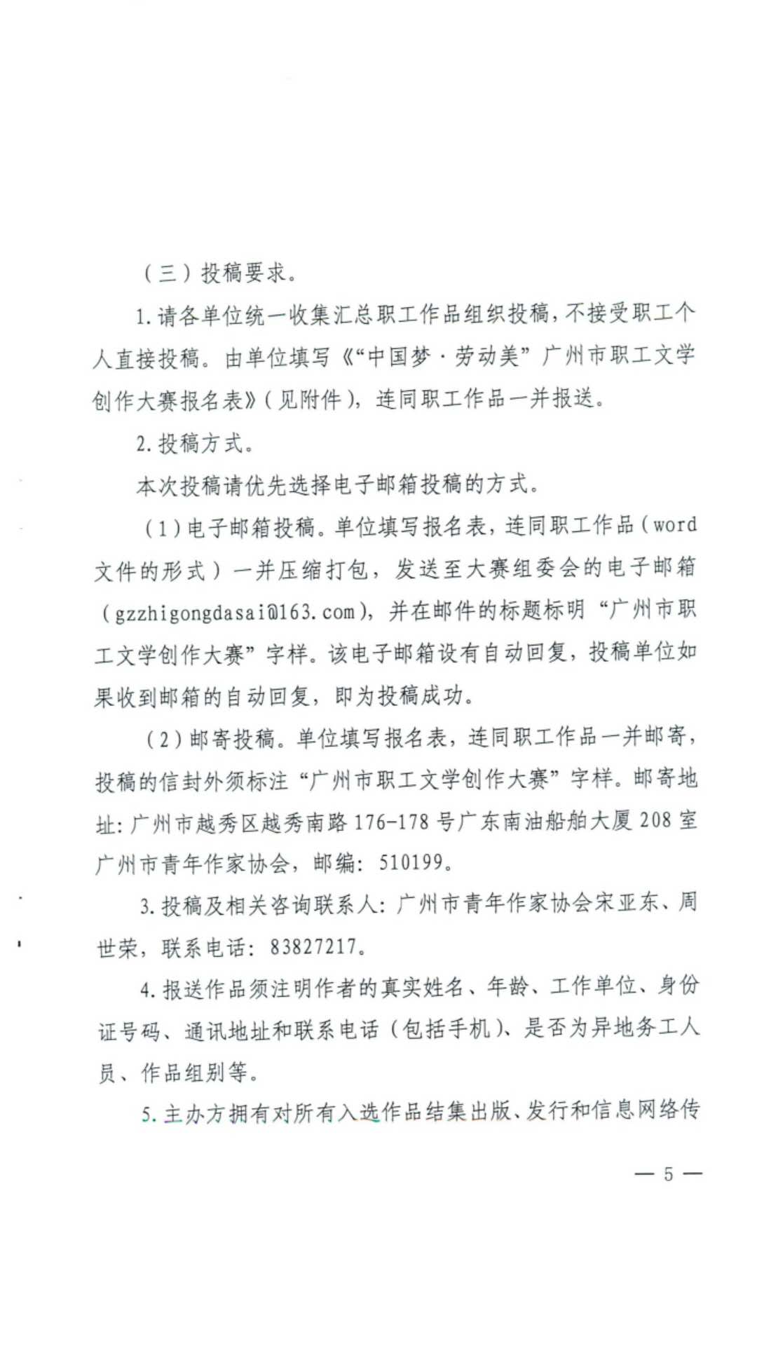 (市總工會(huì)聯(lián)系人:宣傳教育部王雪,聯(lián)系電話:83188108;大賽投稿及咨詢聯(lián)系人:廣州市青年作家協(xié)會(huì)宋亞東、周世榮,聯(lián)系電話:83827217)