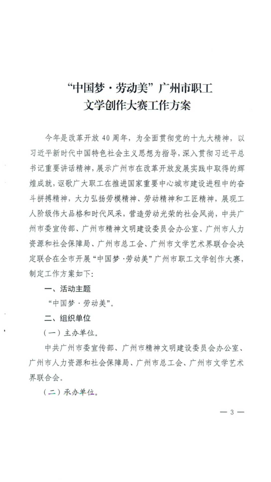 今年是改革開放40周年,為全面貫徹黨的十九大精神,以習(xí)近平新時(shí)代中國特色社會(huì)主義思想為指導(dǎo),深入貫徹習(xí)近平總書記重要講話精神,展示廣州市在改革開放發(fā)展實(shí)踐中取得的輝煌成就,謳歌廣大職工在推進(jìn)國家重要中心城市建設(shè)進(jìn)程中的奮斗拼搏精神,大力弘揚(yáng)勞模精神、勞動(dòng)精神和工匠精神,展現(xiàn)工人階級偉大品格和時(shí)代風(fēng)采,營造勞動(dòng)光榮的社會(huì)風(fēng)尚,中共廣州市委宣傳部、廣州市精神文明建設(shè)委員會(huì)辦公室、廣州市人力資源和社會(huì)保障局、廣州市總工會(huì)、廣州市文學(xué)藝術(shù)界聯(lián)合會(huì)決定聯(lián)合在全市開展“中國夢·勞動(dòng)美”廣州市職工文學(xué)創(chuàng)作大賽,制定工作方案如下:
