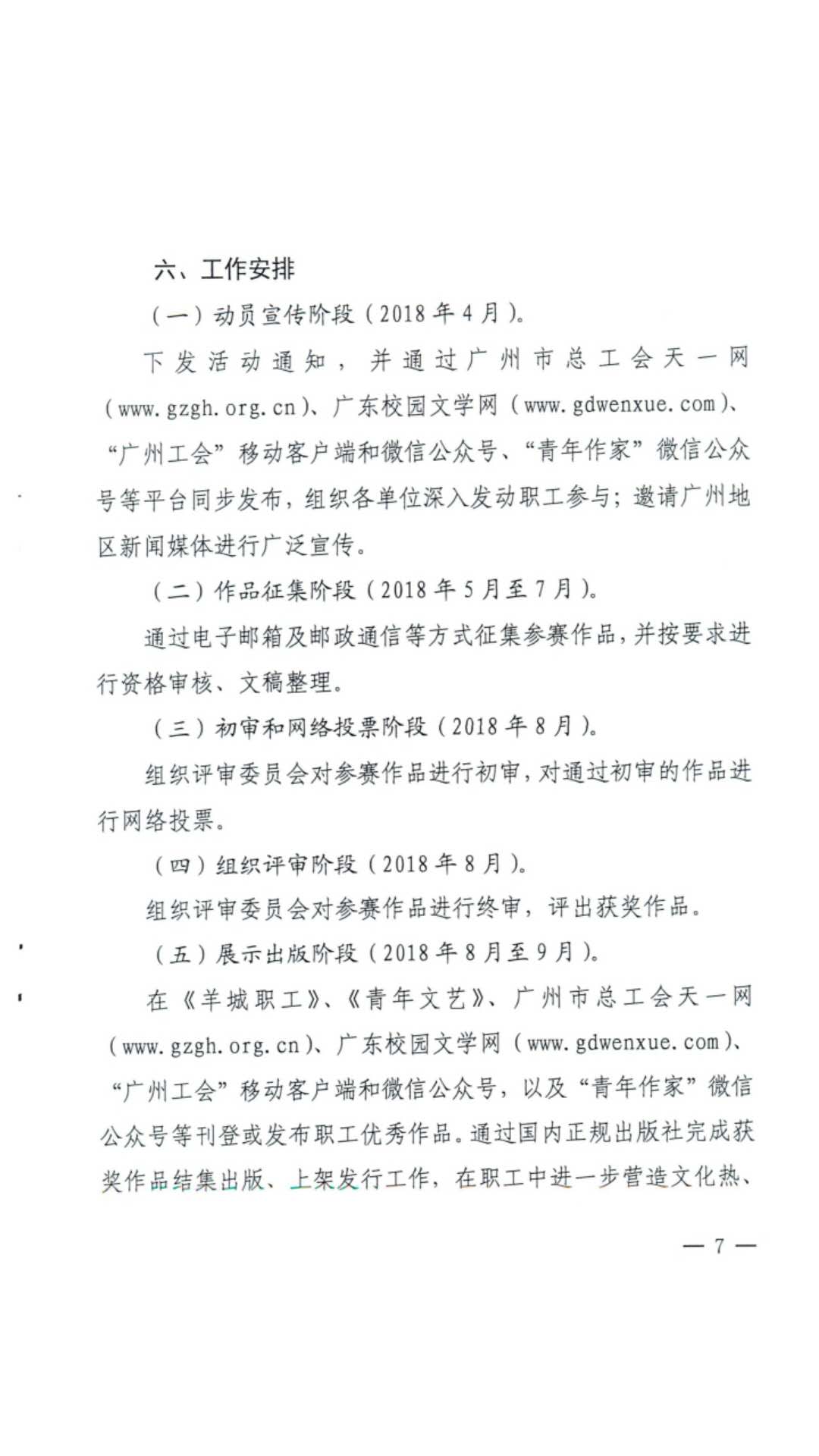 下發(fā)活動(dòng)通知,并通過廣州市總工會(huì)天一網(wǎng)(www.gzgh.org.cn)、廣東校園文學(xué)網(wǎng)(www.ldquan.cn)、“廣州工會(huì)”移動(dòng)客戶端和微信公眾號、“青年作家”微信公眾號等平臺同步發(fā)布,組織各單位深入發(fā)動(dòng)職工參與;邀請廣州地區(qū)新聞媒體進(jìn)行廣泛宣傳。