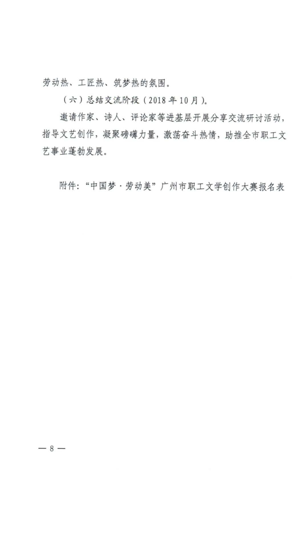 現(xiàn)將《“中國夢·勞動(dòng)美”廣州市職工文學(xué)創(chuàng)作大賽工作方案》印發(fā)給你們,請按照有關(guān)職責(zé)分工,認(rèn)真組織貫徹落實(shí)。