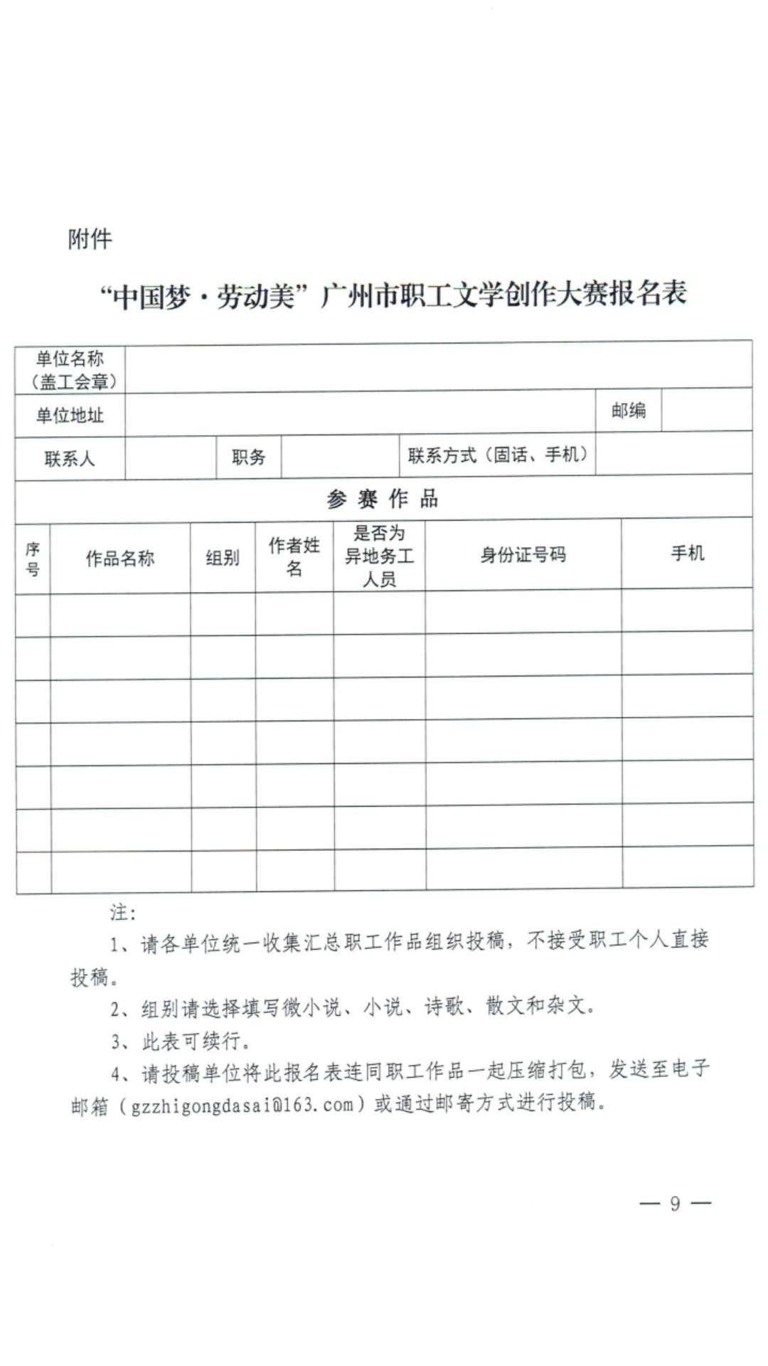 1.請各單位統(tǒng)一收集匯總職工作品組織投稿,不接受職工個(gè)人直接投稿。由單位填寫《“中國夢·勞動(dòng)美”廣州市職工文學(xué)創(chuàng)作大賽報(bào)名表》(見附件),連同職工作品一并報(bào)送。