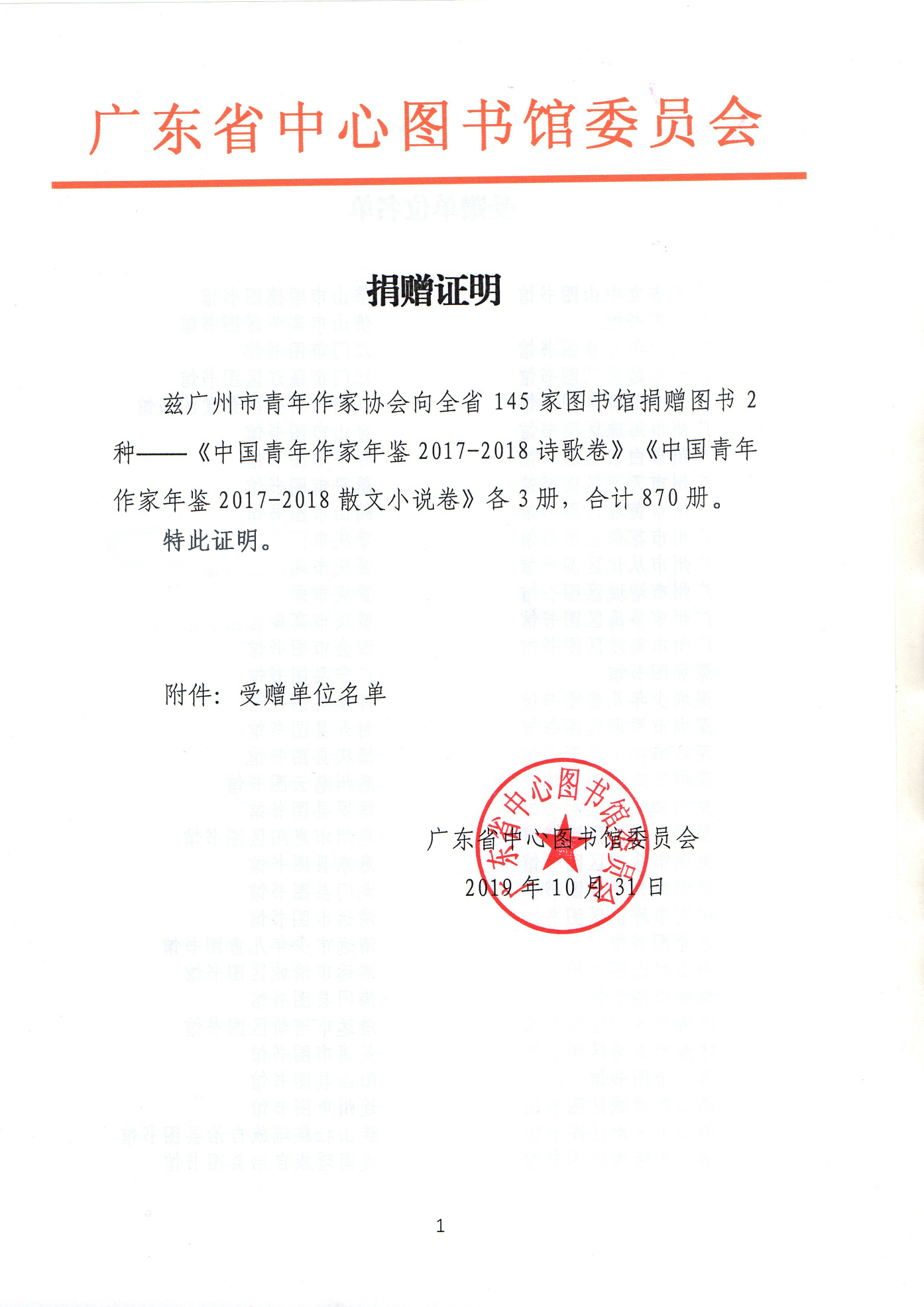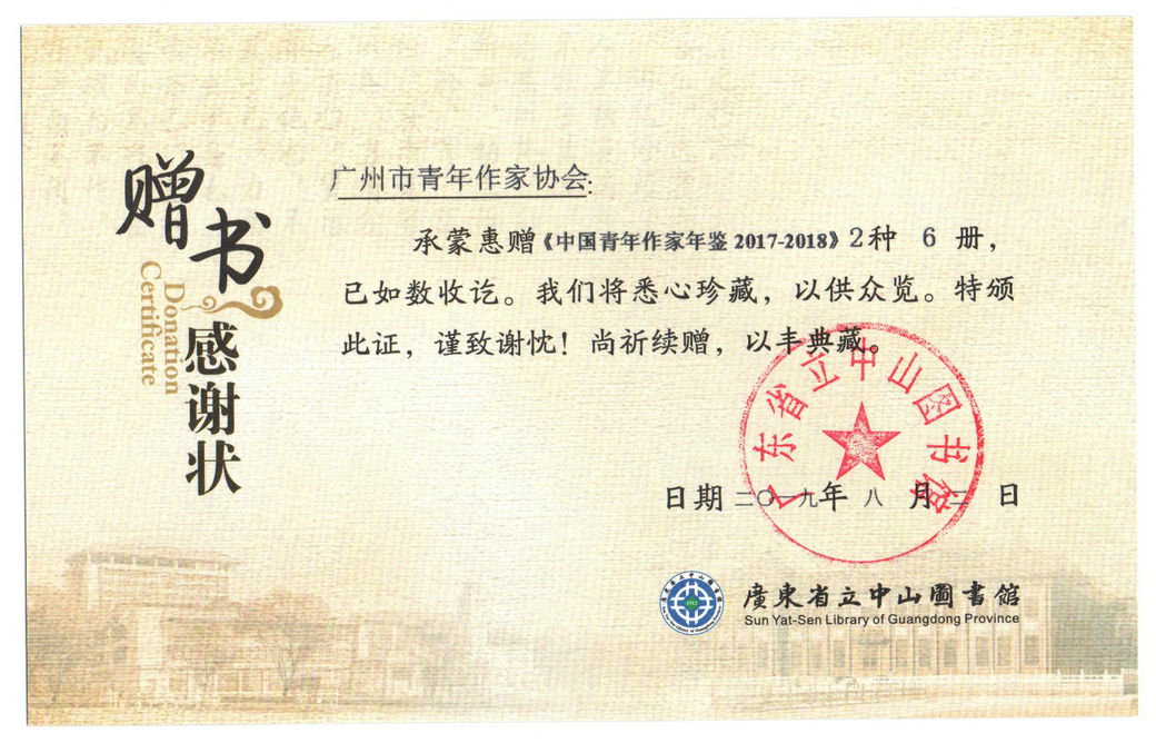 喜訊:中國青年作家全檔案百科全書、權威年度精品選集《中國青年作家年鑒(2017-2018詩歌卷)》和《中國青年作家年鑒(2017-2018散文小說卷)》目前已被國家圖書館收藏。同時,在廣東省中心圖書館委員會的支持下,年鑒還被廣東省立中山圖書館、廣州圖書館、深圳圖書館、東莞圖書館、珠海市圖書館、佛山市圖書館、中山大學圖書館、華南理工大學圖書館、暨南大學圖書館、華南師范大學圖書館等廣東省145家省、市、區(縣)級圖書館和高校圖書館收藏。