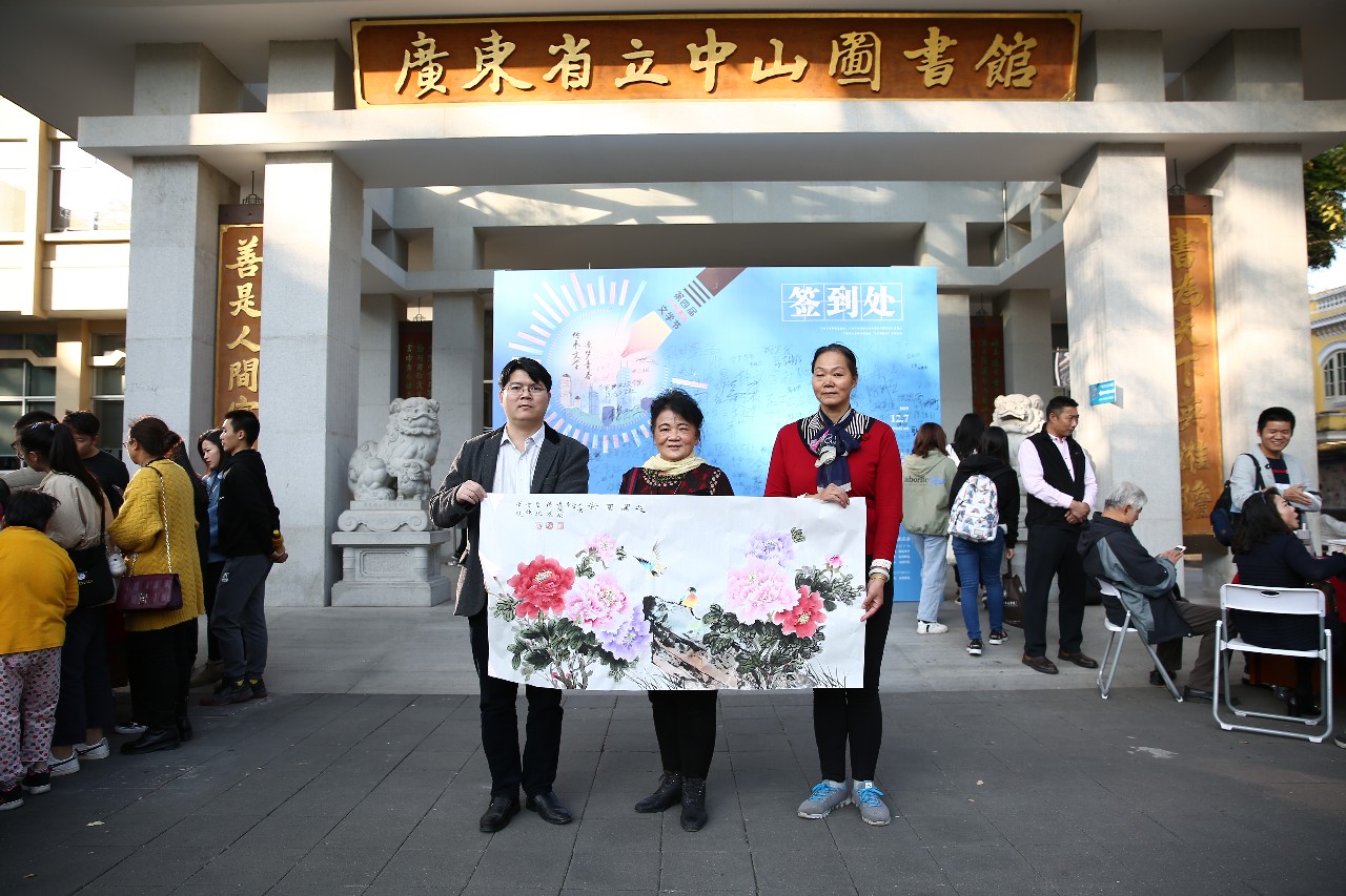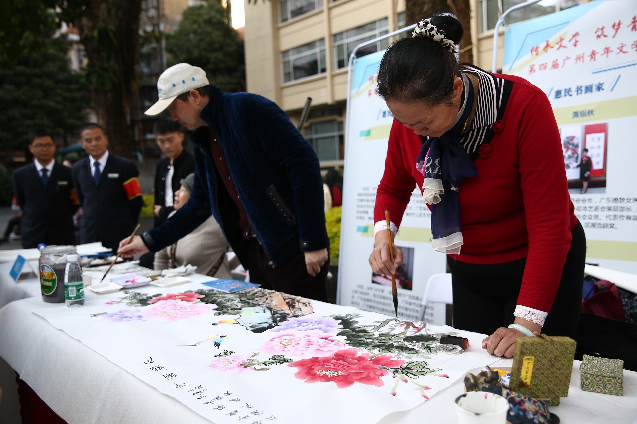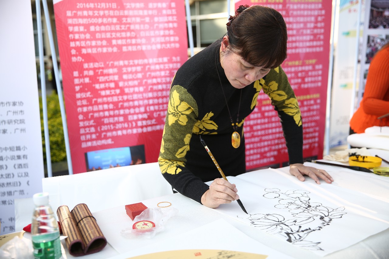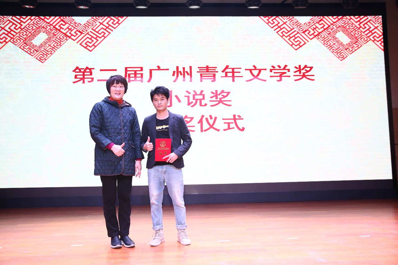 簽售會旁邊,詹海林、黃銀秋、馬健忠、童勝利、孫可、羅燕媚、郭英珊、楊小紅、曾敏、陸凌、關婉玲、周健明、戴彩云等老中青三代13名書畫家現場潑墨揮毫,創作了一幅幅精美的字畫作品,免費贈送,文藝惠民,受到不少書畫收藏者和大量市民的追捧。場外交流的氣氛熱火朝天,與此同時,在圖書館報告廳舉辦的場內頒獎典禮也在有序進行。本屆文學盛會的重頭獎——由廣州市青年作家協會、廣東校園文學網主辦的“第二屆廣州青年文學獎”現場揭曉。李潔珊、巫宏振榮摘小說獎,王國省、吳朝、黃雅青喜獲散文獎,郭濤、彭海波、盧靜云斬獲詩歌獎。廣州市青年作家協會主席湯炎忠表示:“連續二屆的廣州青年文學獎,是推進廣州文學界新生力量發展的一種探索嘗試,以會員內部評選為主,希望拋磚引玉,借此激發青年作家的創作熱情,擦亮廣州青年文學名片。”