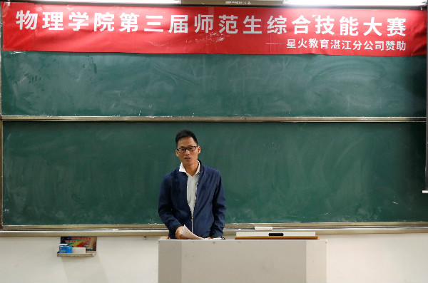 12月8日上午,物理學(xué)院在榕燕樓107室舉辦了由星火教育贊助的第三屆師范生綜合技能大賽(地理組)。出席本次活動(dòng)的嘉賓有院黨委梁偉民副書(shū)記、星火教育湛江公司龍文英和卓彩詩(shī)老師、地理系尚志海主任、黃日輝副主任、邱雅楠老師、陳碧珊老師、萬(wàn)海波老師、宋秀麗老師、黃慈慶老師、莫濟(jì)貴老師、肖培朗老師和許恩蘭老師。