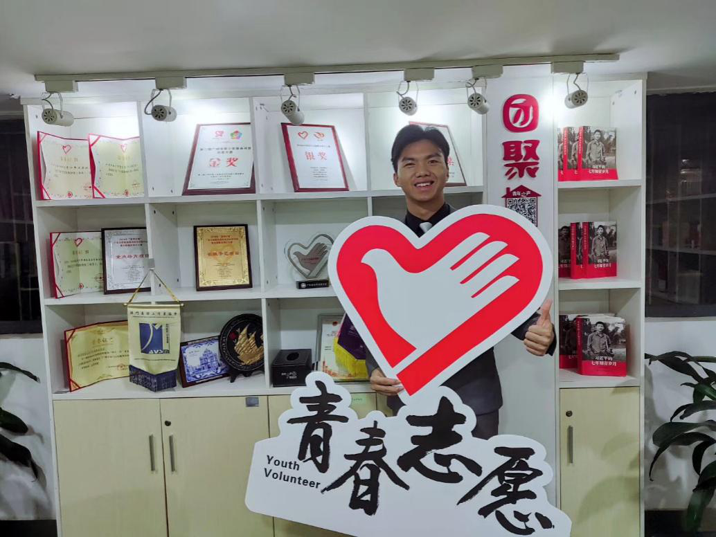 林觀旺,二十歲,廣州市南沙區青春志愿服務研究院“志愿網絡學院”的執行院長。