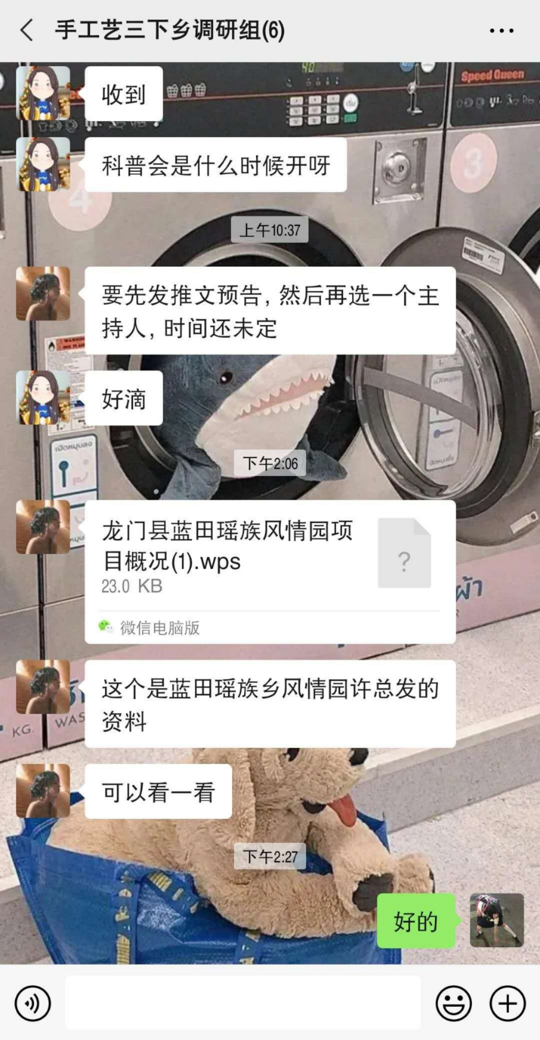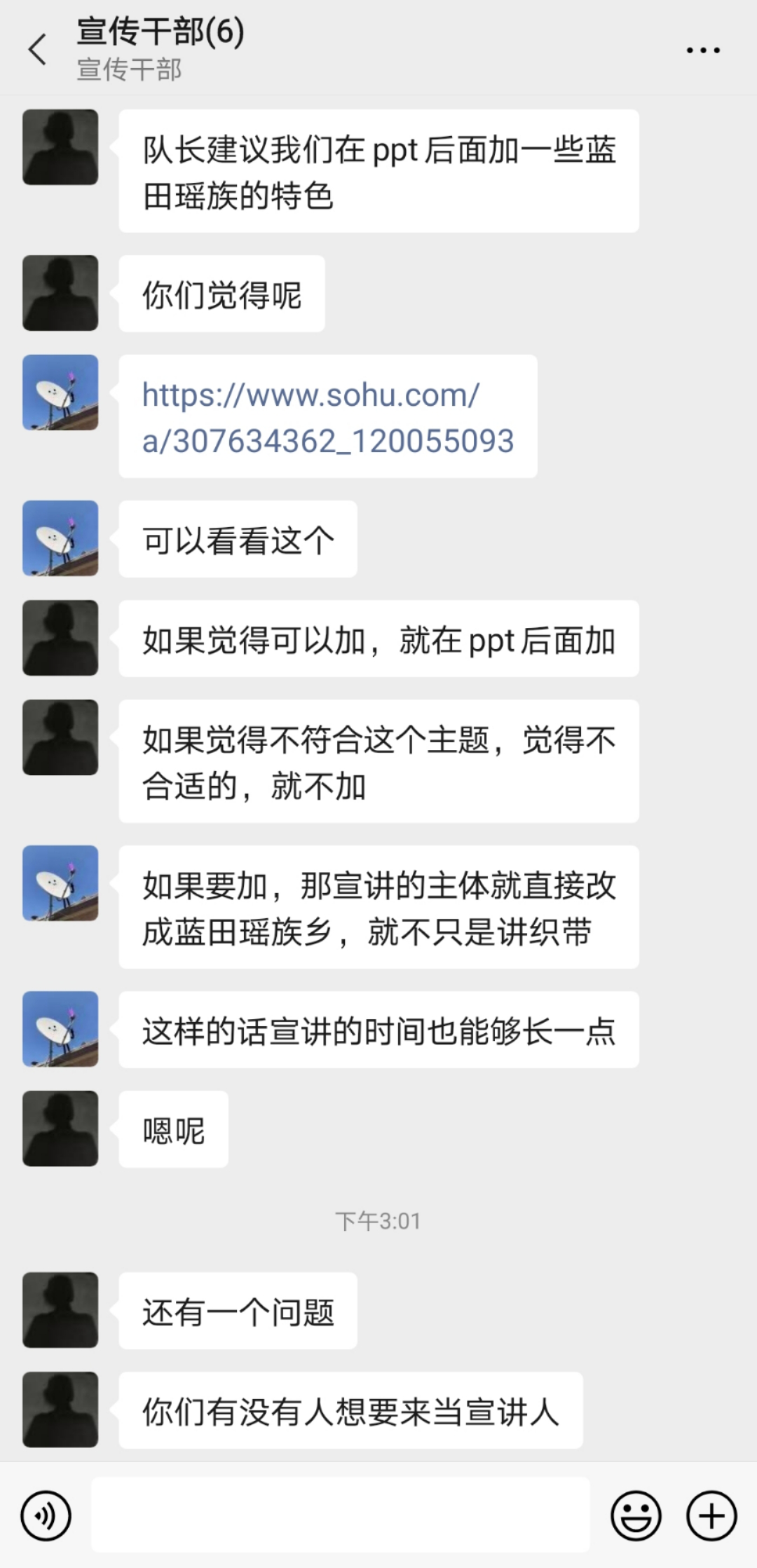 今天上午8點19分,隊長向調研組和宣傳組的隊員們下達了“完善科普PPT,準備科普宣講會”的任務。調研組在副組長的帶領下查看藍田瑤族風情園許總發來的龍門縣藍田瑤族風情園項目概況,了解更多有關于藍田瑤族鄉的資料。而宣傳組也在組長和副組長的帶領下對藍田瑤族鄉的特色文化展開資料收集和整理,由組長進行匯總并完善明日“藍田瑤族鄉”宣講會將用到的宣傳PPT。
