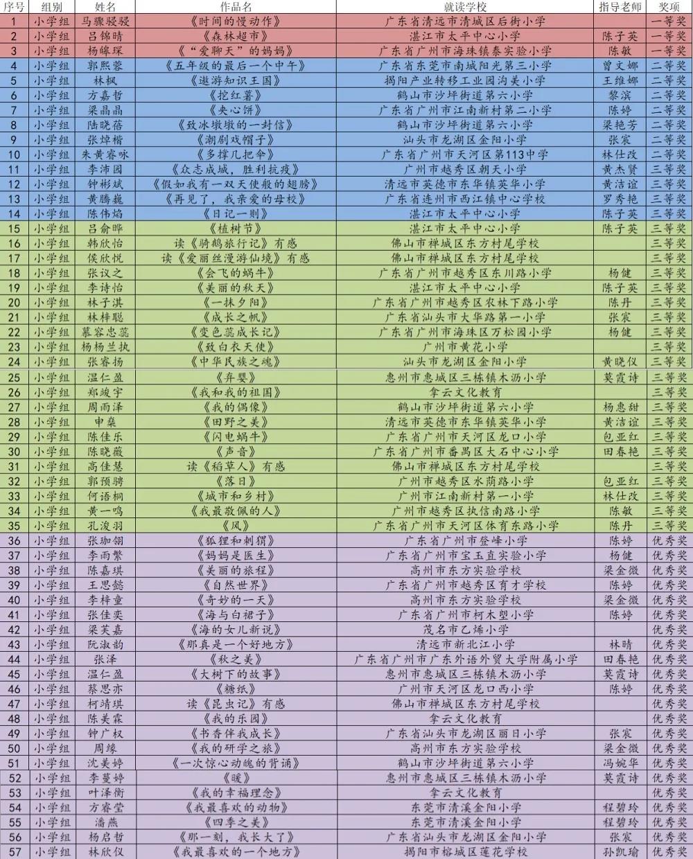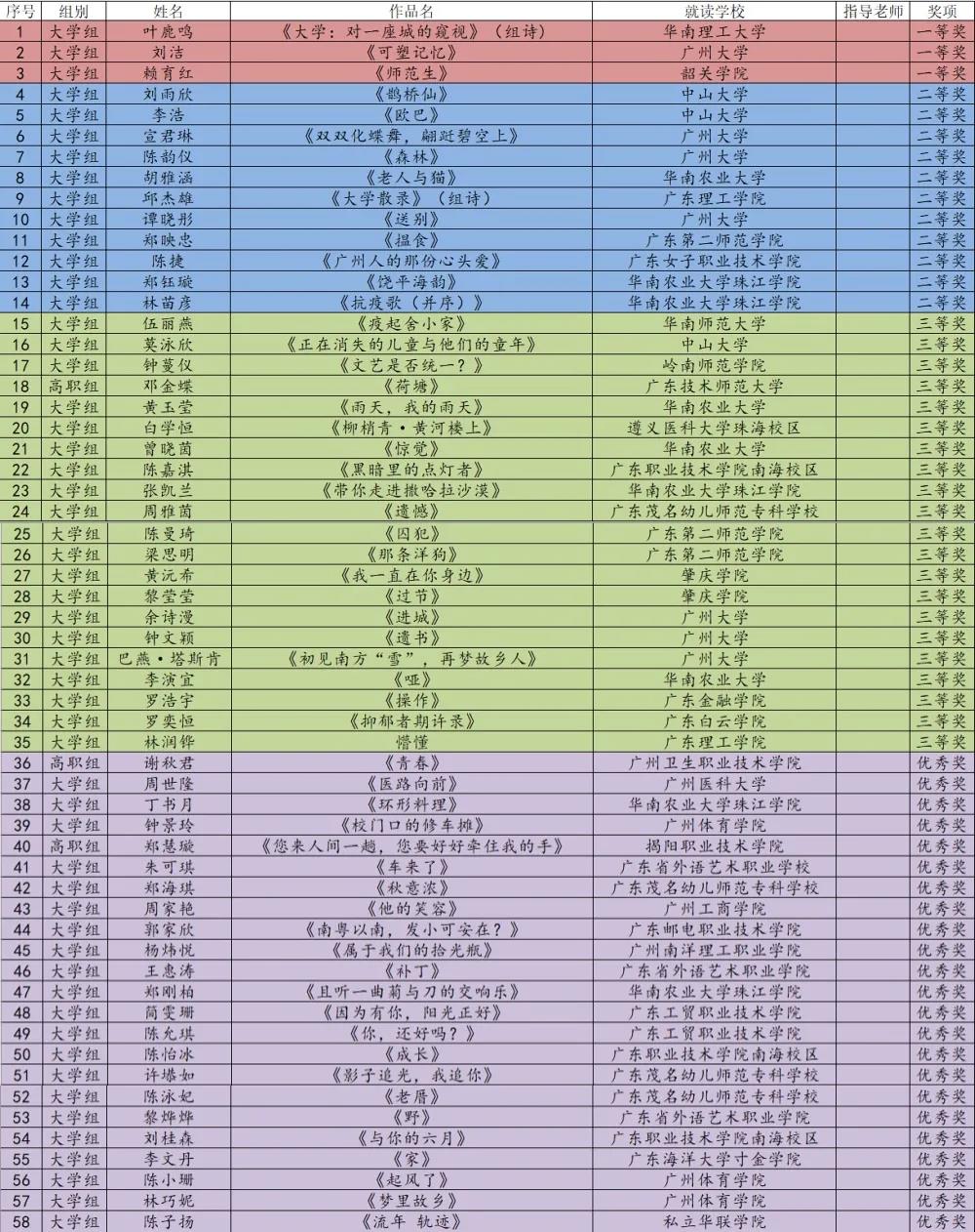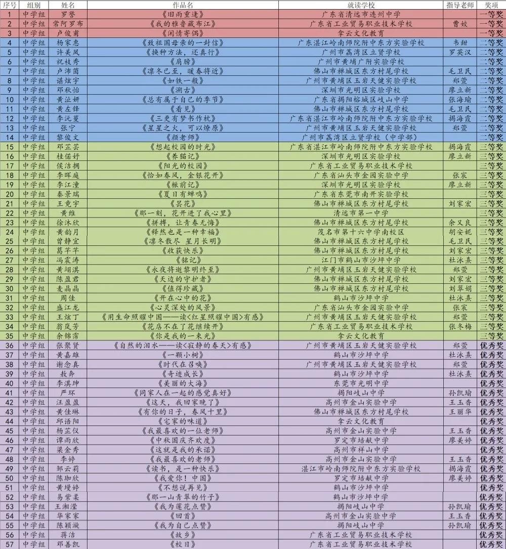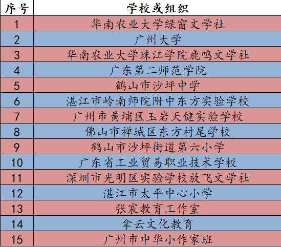 2020年5月,由廣州市青年作家協會、廣東校園文學網主辦的第三屆廣東校園文學大賽面向廣東省全體在校學生進行征文活動,得到了各組織單位、廣大文學愛好者的積極響應、熱情參與,上報稿件5700余份。經大賽組委會審核、評定,決定對大賽期間工作成績突出的單位、表現優異的個人進行表彰,現將第三屆廣東校園文學大賽獲獎名單公布如下: