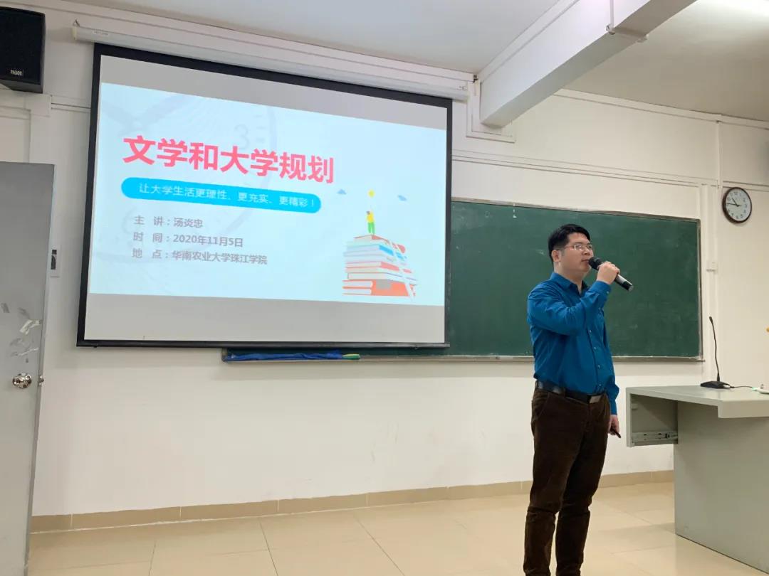11月5日,廣東校園文學網入駐儀式暨校園文學講座活動在華南農業大學珠江學院舉辦。我會主席湯炎忠應邀為同學們作了“文學和大學規劃”主題講座。華南農業大學珠江學院人文學院院長陳軍,以及200余名大一新生參加了活動。