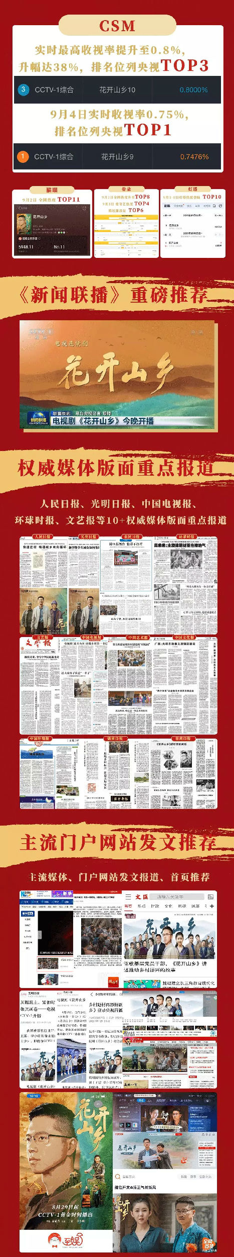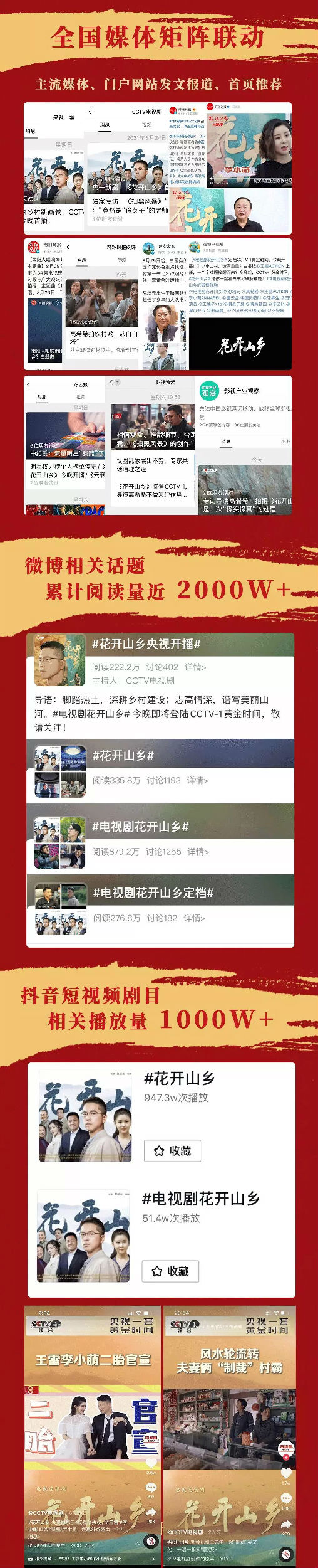 電視劇《花開山鄉》(原名《鄉村第一書記》)繼《新聞聯播》節目重磅推介,權威媒體和主流門戶網站發文推薦之后。《花開山鄉》(原名《鄉村第一書記》)在微博的相關話題閱讀量和討論度直線上升。劇的片段在抖音等短視頻平臺的播放量也取得了優異的成績。