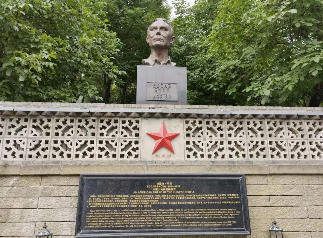 眼下,廣場鑲嵌著的那顆巨大的紅星,在紅星樓與紅星亭,在四周山坡俯視下顯得更加真切而富有詩意。斯諾先生的胸像,就坐落在廣場一側。整個紅星廣場,體現的主題顯然就是《紅星照耀中國》。此刻的作者斯諾,他采訪毛澤東的傳奇故事和生動內容,早已詩意地定格為重要歷史篇章。斯諾的銅像,他的目光是安祥專注的,同時又透露出某種難以言說的憂慮。據說另一座同樣的雕像,是坐落在美國的堪薩斯城。兩座雕像,遠隔千里萬里,卻是同一種心情和目光。眼球原本是大海的顏色,如今反射著金色陽光。越來越多的人們來到紅星園,拜謁注視這目光,想象中穿越大洋,遙相呼應,構成了紅星園的靈性與魂魄。