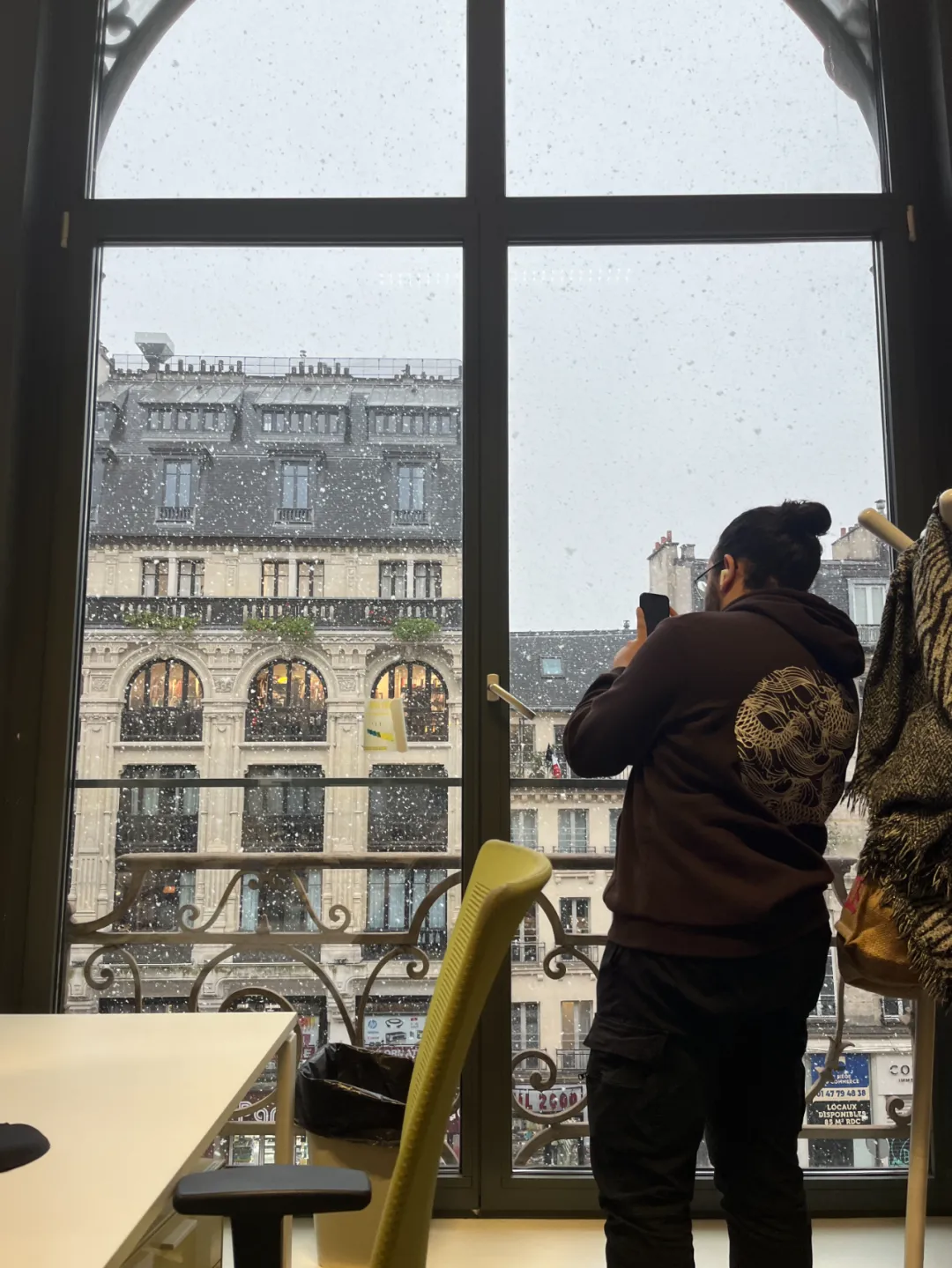 最近想起來記日記也是因為巴黎下了初雪,也就是三天以前。周四上午十點半,身為學(xué)徒的我還在辦公室因為黑色星期五的KPI壓力瘋狂push,頭戴耳麥的我突然轉(zhuǎn)頭看向右邊窗外,突然瞥見泡沫一般的雪突然像老天爺灑禮物一般,模糊著我們對面的建筑物。坐在工位上的我大驚一聲,馬上跑向簾幕邊打開窗戶錄下這驚喜時刻。明明我去年身處在阿爾卑斯山腳,卻也沒有見到這番景象:白色精靈在沉寂已久的視覺中成群涌現(xiàn),跳躍。我想到小時候在廣播臺念過的一篇詩歌,因為沒有古詩能夠匹配此情此景。或許是我讀過的書太少,而巴黎的現(xiàn)代與古典交織更是給想要把落雪時刻記述下來的我刷新了記憶。已分不清是雪太潔白,還是言語太蒼白……