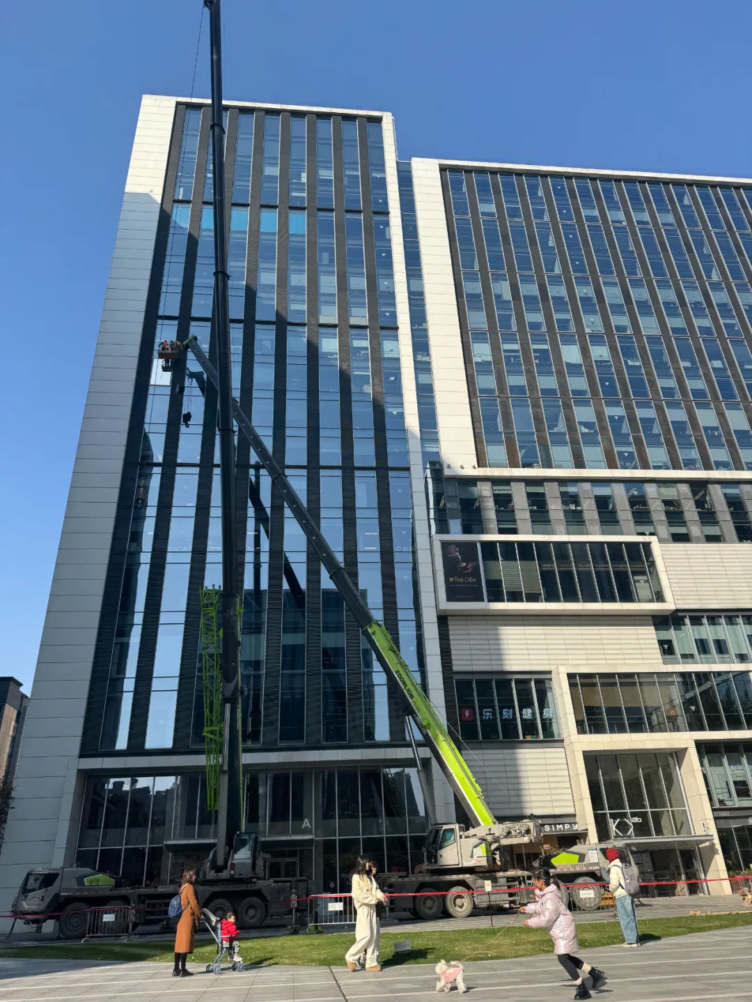 過了約莫兩刻鐘,在空中支撐許久的機械臂終于開始動工,只見它緩緩地將兩位作業工人運送到高空中靠近商城邊上寫字樓的窗戶外,應該是十二三層樓左右。原來是那層樓外側的玻璃窗碎裂了,需要替換新的玻璃窗。