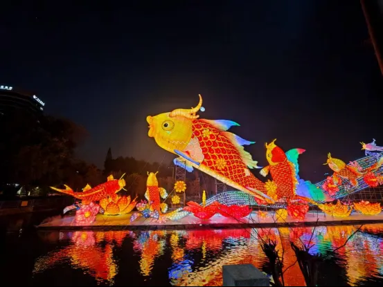 來到北秀湖邊,便看到了本次燈會的主角,不得不承認,最先看到的是——人頭。無數(shù)的游客舉著手機,甚至有人拿出了2米的拍攝桿,把河邊圍得水泄不通。好不容易找了個縫隙才得以見到真容。整個主體沿湖而設(shè),燈帶組成的光帶象征著河流,而各色的錦鯉便附著其上,生動可感。為首的是一只巨大的錦鯉,它屈身擺尾,仿佛是在向前游動,其后有著稍小的錦鯉,仿佛是要躍出水面,爭相與游客們互動。再往下走,卻有一棵樹阻斷了原本連續(xù)的燈帶,然而,設(shè)計者們巧妙利用了這棵樹,將數(shù)十條淺黃色小錦鯉掛在樹枝上,反而更增添了趣味,同時這淺黃色也調(diào)和了過于厚重的色彩,反而體現(xiàn)了中國人執(zhí)中至和、天人合一的智慧。