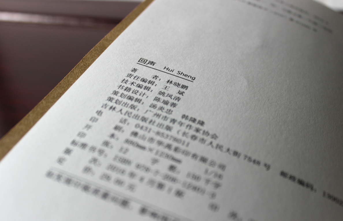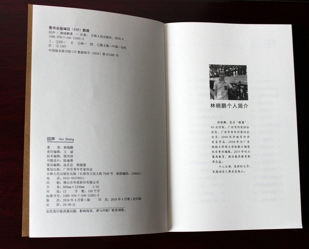 林曉鵬散文集《回聲》2016年由廣州市青年作家協會策劃、吉林人民出版社出版,是一本關于后青春時期的散文集,偶或穿插一些短詩。主要內容記錄了作者2013年至2015年的一些所感所悟,分別為“2013年?疏桐”、“2014年?雨影”和“2015年?清風”三個部分,總共99個文章。 林曉鵬簡介: 林曉鵬,男,筆名“酷暑”。廣東揭陽人,現居廣州。廣州市青年作家協會散文創作委員會委員、廣州市作家協會會員。2006年開始寫作并發表作品,2008年為廣東校園文學網大學版散文隨筆欄目責任編輯。作品散見于《揭陽日報》、《晨曦》、《四季》、《青年文摘》、《意林》等刊,2013年創立集思教育,現任集思教育教學總監。