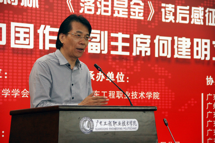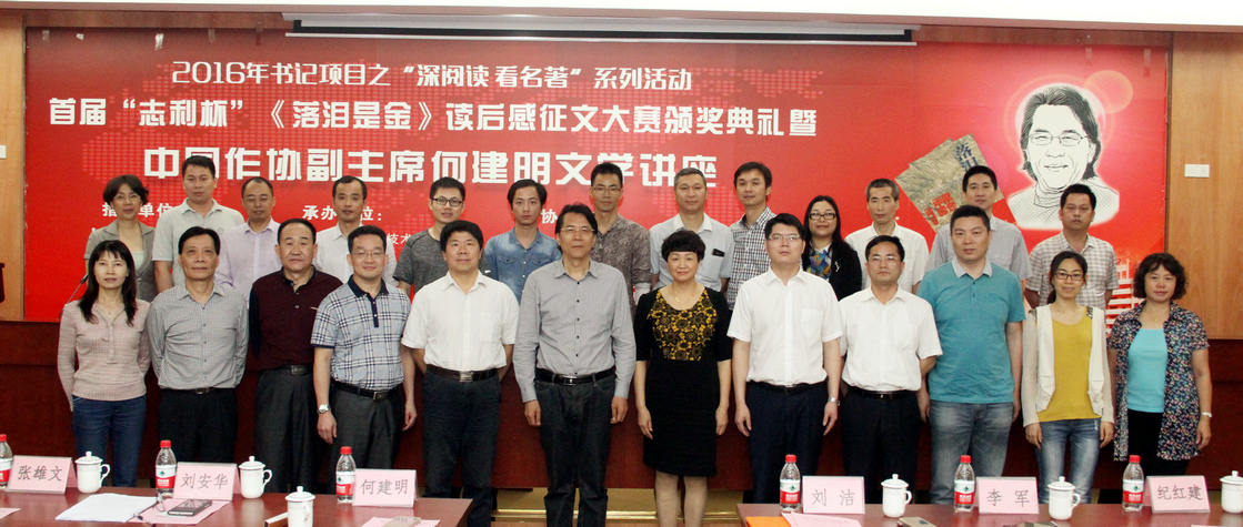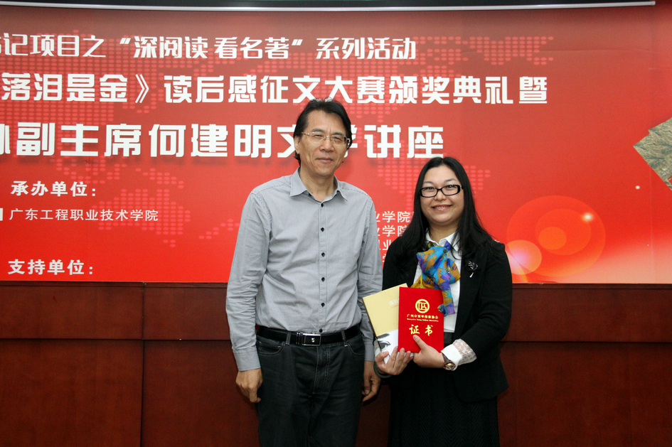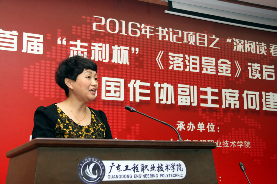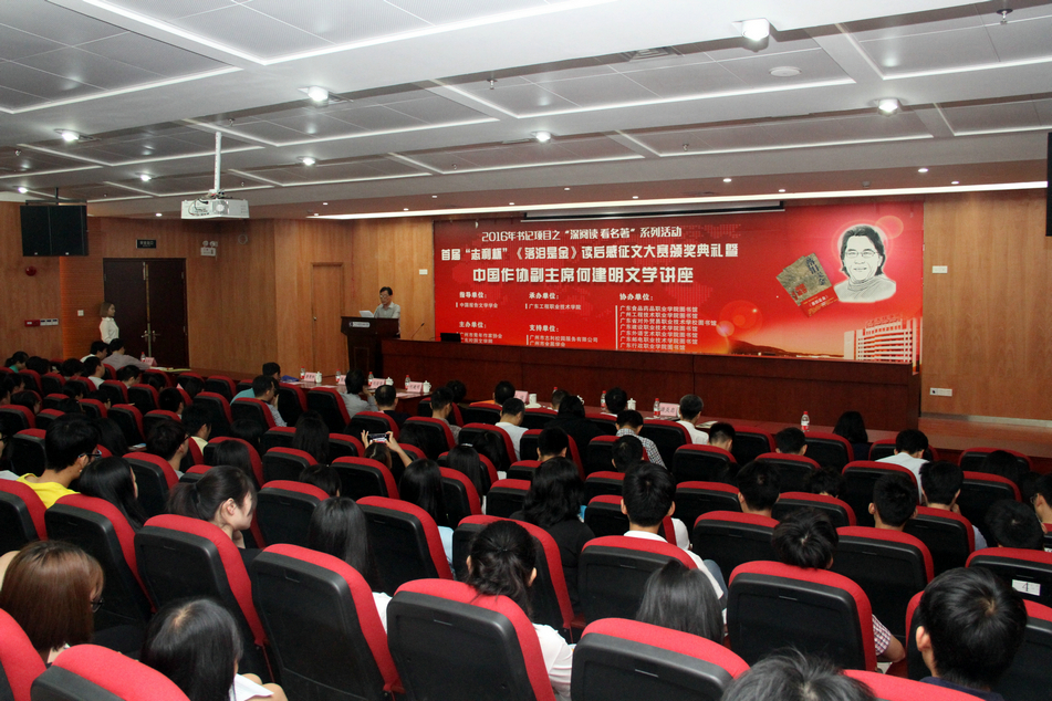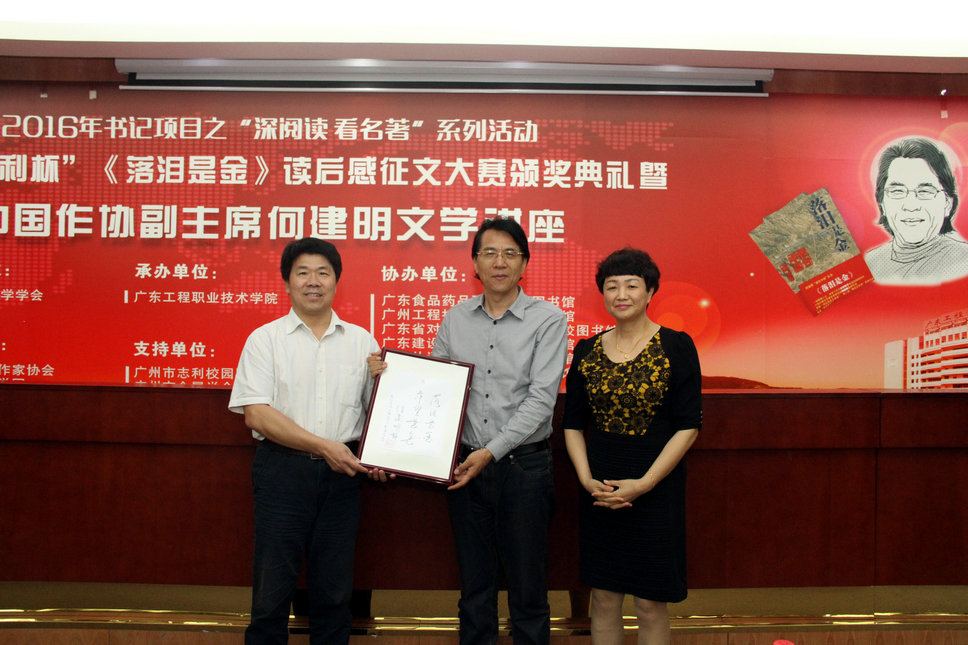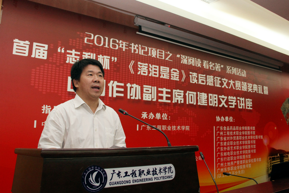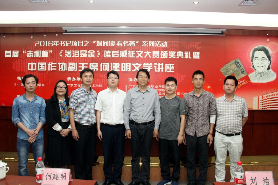 2016年4月29日,“深閱讀 看名著”系列活動——首屆“志利杯”《落淚是金》讀后感征文大賽頒獎典禮暨中國作協副主席何建明文學講座在廣東工程職業技術學院學術報告廳隆重舉行。 中國作協副主席、中國作家出版集團黨委書記、中國報告文學學會會長何建明,中國報告文學學會理事、中國報告文學學會青年創作委員會副主任紀紅建;中國報告文學專家張雄文;廣東工程職業技術學院黨委書記劉潔、院長劉安華,廣州市作協副主席、中國報告文學學會青年創作委員會副主任謝友義;廣州市青年作家協會主席、廣東校園文學網總編輯湯炎忠,廣州市青年作家協會副主席陳超、邱少梅、陳錚和理事郭錦生、黃宇,廣州市志利校園服務有限公司副總經理游貴和,廣州市金屬學會秘書長陳學文,廣東食品藥品職業學院圖書館館長夏年軍,廣東外語藝術職業學院圖書館館長凌征強,廣州東華職業學院圖書館館長左君,廣東郵電職業技術學院圖書館館長黃燕玲,廣州土地房產管理職業學校圖書館館長劉清俊等領導嘉賓,以及來自廣東各地的獲獎選手、師生代表等近300人出席盛會。 本次活動,由中國報告文學學會指導,廣州市青年作家協會、廣東校園文學網主辦,廣東工程職業技術學院承辦,旨在認真貫徹落實習總書記在文藝工作座談會上的講話精神,號召青年特別是在校大學生重溫經典,提高創作水平與欣賞能力,挖掘和培養文學新人,煥發青年正能量,繁榮校園文化事業。 活動共有廣東工程職業技術學院圖書館、廣東食品藥品職業學院圖書館、廣州工程技術職業學院圖書館、廣東省對外貿易職業技術學校圖書館、廣東建設職業技術學院圖書館、廣東外語藝術職業學院圖書館、廣東郵電職業技術學院圖書館、廣東行政職業學院圖書館、廣州土地房產管理職業學校圖書館、廣州東華職業學院圖書館等廣東十所院校圖書館聯合協辦,并獲得廣州市志利校園服務有限公司、廣州市金屬學會等有關單位的大力支持。